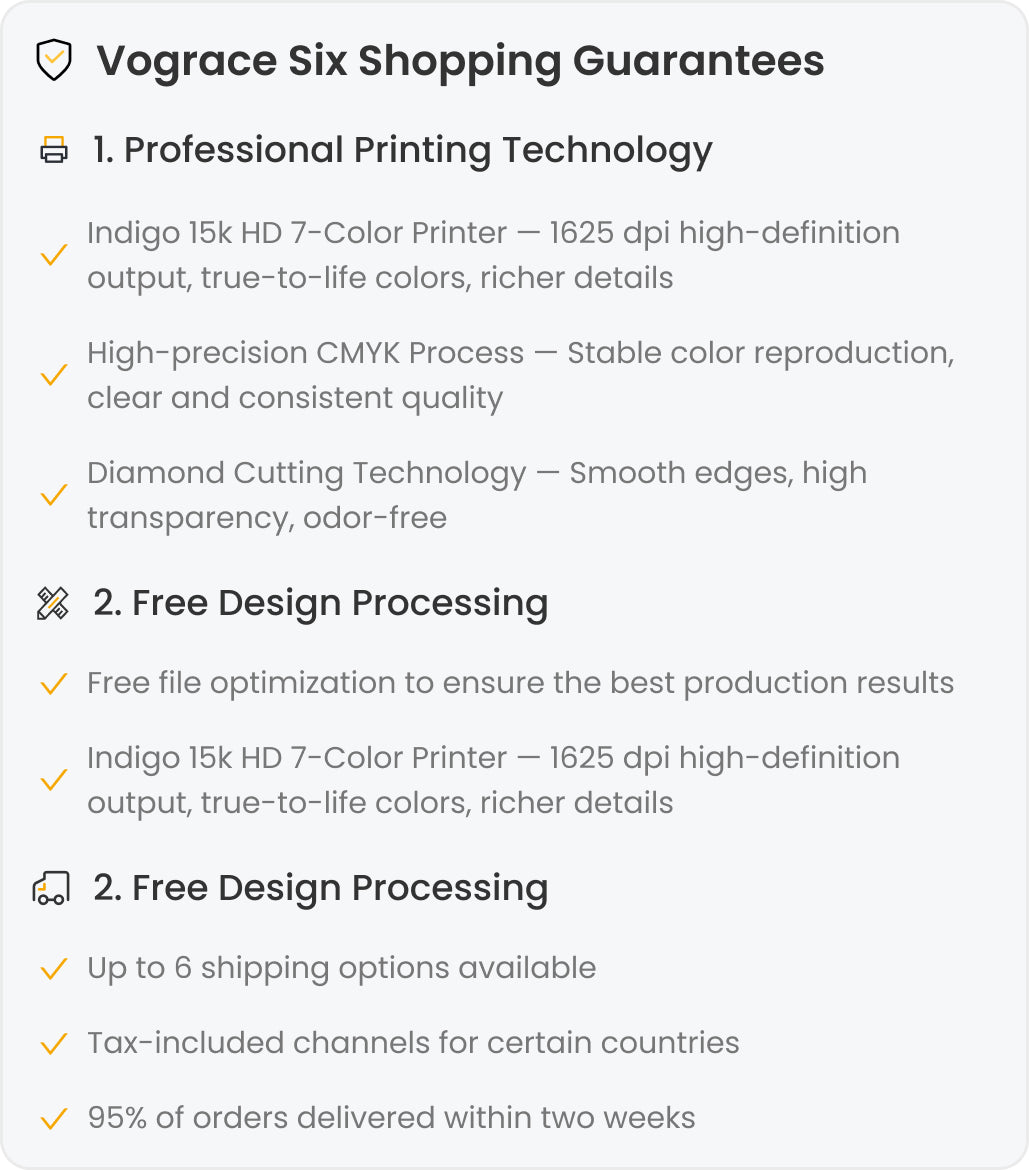 I've tried different sites to print my stickers in the past years and I have to say Vograce is truly the best one, so I'll be printing more and more in the future! 100% satisfied!! Thank you <3