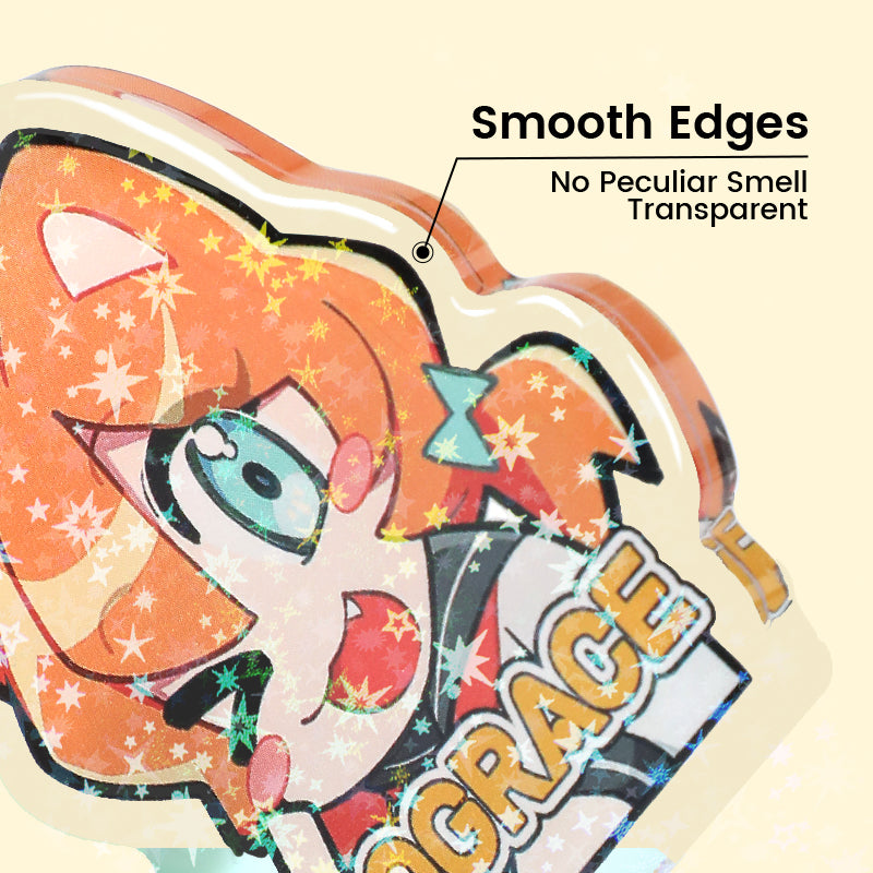 Les porte-clés en acrylique transparent personnalisés de Vograce sont durables, inodores, résistants à l'eau et légers. Les charms en acrylique sont vifs en couleur et en motif et ne tomberont pas, les bords sont lisses et translucides. Vous pouvez choisir parmi une variété de processus supplémentaires tels que l'époxy, l'holographique, etc.